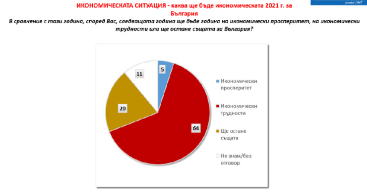 Що се отнася до очакванията за икономическата ситуация, настроенията у нас отново са по-скоро негативни. Едва 5% от българите очакват година на икономически просперитет, 64% смятат, че 2021 г. ще е година на икономически трудности, а 20% очакват икономическата ситуация в страната да е същата като през 2020 г. Останалите се затрудняват да отговорят. Според анкетата и по този показател страната ни е сред топ 5 на негативните отговори.