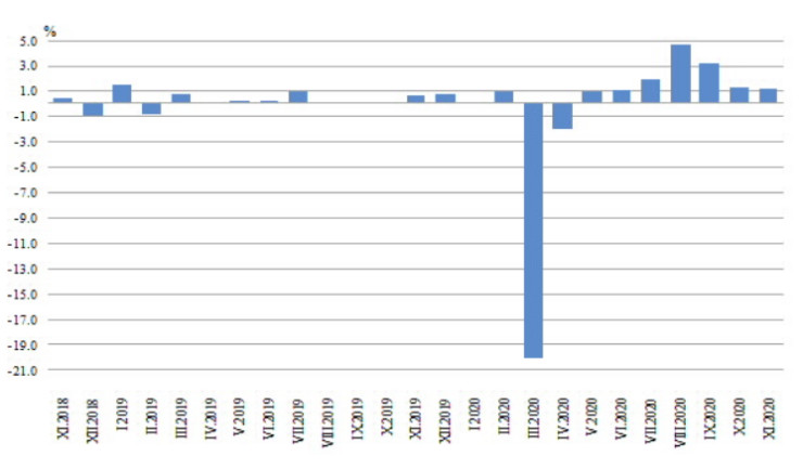 Спрямо година по-рано през ноември се наблюдава спад на оборота при търговията на дребно с автомобилни горива и смазочни материали (с 15,8%) и при тази с хранителни стоки, напитки и тютюневи изделия (с 14,4%).