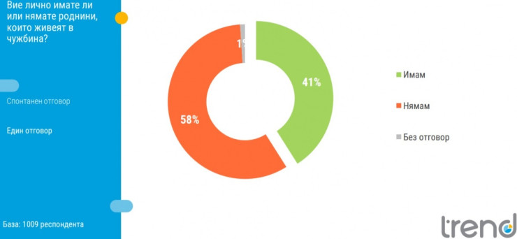 Според данните 41% от българите имат роднини, които живеят в чужбина. Живеещите в селата в най-голям дял посочват, че имат роднини в чужбина, спрямо живеещите в други населени места.