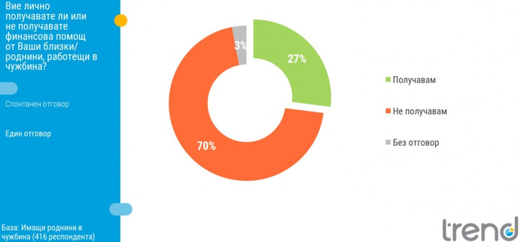 27% от имащите роднини в чужбина разкриват, че получават финансова помощ от тях. Хората на възраст 60-69 г. и 70+ в най-големи дялове информират, че редовно получават пари от близки и роднини в чужбина.