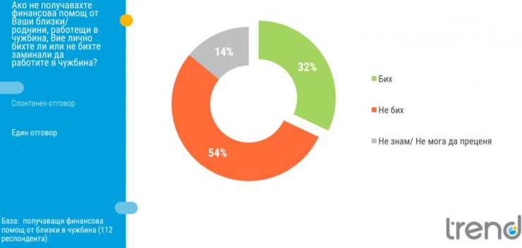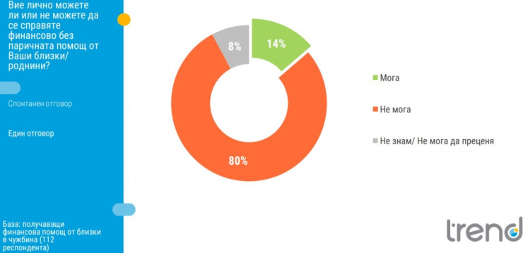 80% от хората, които получават такава финансова помощ посочват, са категорични, че не могат да се справят без нея. Едва 14% са категорични, че могат да се справят и без тази финансова подкрепа. Една трета от хората, които получават финансова помощ от българските емигранти, твърдят, че биха заминали в чужбина, ако не получават тази подкрепа, като това важи в най-голям дял при най-младите.