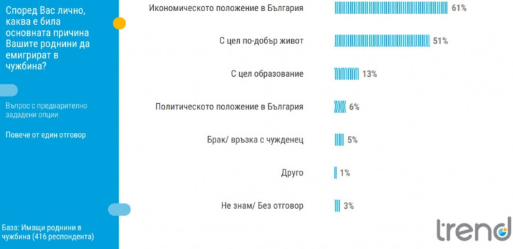 Сред основните причини за емиграцията на техните близки и роднини 61% посочват икономическото положение в България, 51% „с цел по-добър живот“, а 13% с „цел образование“. Сред изтъкнатите причини е и брак или връзка с чужденец.