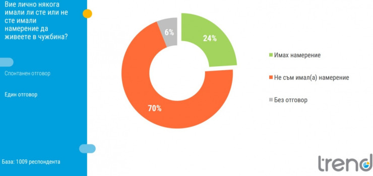 Всеки четвърти българин е имал намерение да живее в чужбина. Това сочи проучване на „Тренд“, посветено на нагласите на българите спрямо емиграцията, сред 1009 души, анкетирани в периода между 26 ноември и 3 декември 2020 г. по поръчка на вестник „24 часа“.