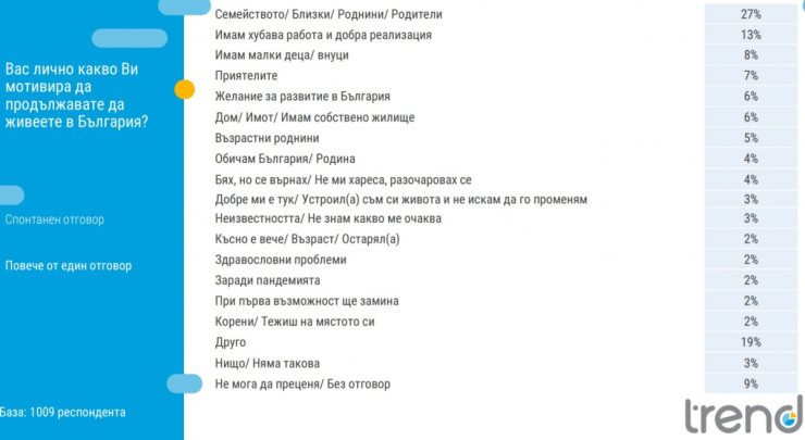 24% от българите посочват, че са имали намерение да живеят зад граница, а 70% не споделят такова намерение. Сред основните причини да не заминат се изтъкват семейството и родителите – 27%. За 13% причината да не станат емигранти е хубавата работа и добрата реализация, а за 8% - малки деца или внуци. Сред изброените причини са също възрастни роднини, любов към България, желание за развитие в нашата страна, страт от неизвестното, по-спокоен живот в родината.
