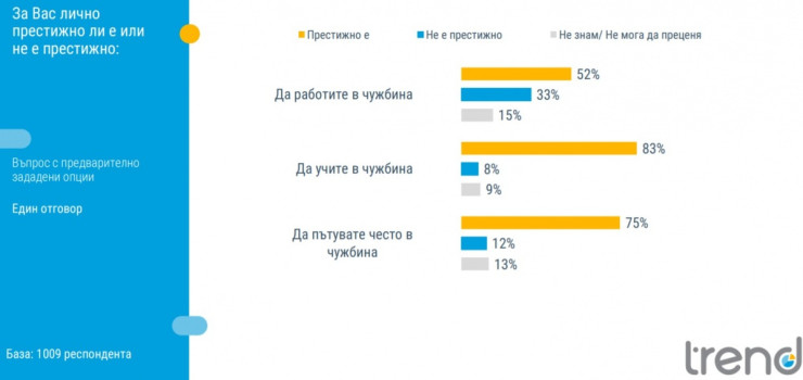 52% от българите смятат, че е престижно да се работи в чужбина, а 33% са на противоположното мнение. Сред най-младите е най-голям делът на тези, които твърдят, че да се работи зад граница е престижно.