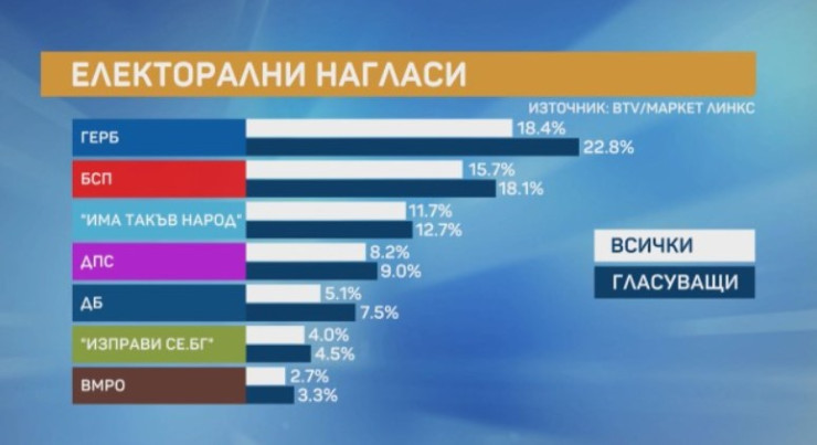 Седмица преди редовните парламентарни избори се запазва дистанцията между основните политически играчи. ГЕРБ водят, на второ място са БСП, трети са "Има такъв народ". Това показва проучване, финансирано и реализирано съвместно от bTV и "Маркет линкс", проведено сред 1026 лица над 18 години в страната в периода 18-25 март по методите на пряко-лично интервю и онлайн анкета.