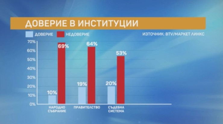 Преди вота цифрите показват рекордно недоверие в Народното събрание (69%), правителството (64%) и съдебната система (53%).