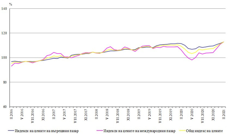Индексът на цените на производител на международния пазар през февруари се увеличава с 1,8% спрямо януари, а на годишна база увеличението е с 6,2%.