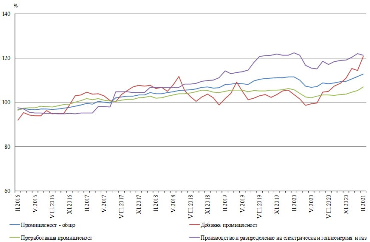 Данните на статистиката показват, че през февруари има повишение на месечна база на цените в преработващата промишленост - с 2%, а намаление е отчетено в добивната промишленост - с 3,1%, и при производството и разпределението на електрическа и топлоенергия и газ - с 0,3%.
