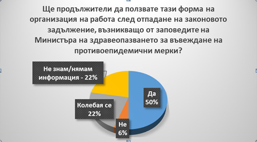 Половината работодатели в България възнамеряват да продължат прилагането на дистанционните форми на заетост и след отпадане на извънредните противоепидемични мерки, други 22% се колебаят. Едва 6% ще се откажат от „хоум офиса“ като начин на организиране на работния процес, а 17% от работодателите не прилагат работа от разстояние.