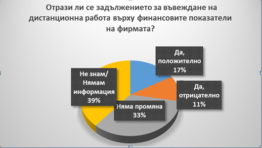 Това показва анкетно допитване на Българската асоциация за управление на хора (БАУХ) и Българската стопанска камара (БСК) на тема „Covid-19 и работата от разстояние“. Проучването е проведено в периода 2 – 25 април 2021 г. сред ръководители „Човешки ресурси“ от 180 предприятия в цялата страна и от почти всички сектори на икономиката.