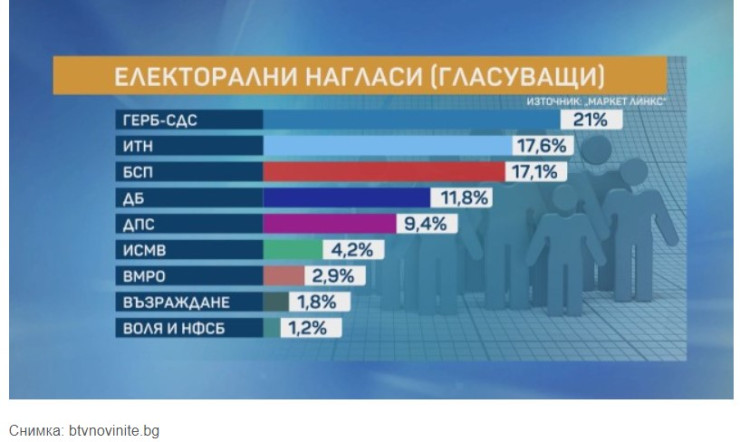 Разликата в подкрепата между ГЕРБ и партия "Има такъв народ" (ИТН) на Слави Трифонов е под 4 процентни пункта, сочи последното социологическо проучване на "Маркет линкс", обявено по bTV. ГЕРБ получава подкрепата на 21% от анкетираните при 17,6% за ИТН.