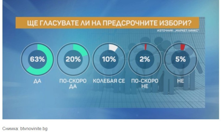 "63% са декларирали, че ще гласуват на предстоящите парламентарни избори, това може би ще ни доведе до по-висока избирателна активност, коментира управителят на "Маркет линкс" Добромир Живков. - Около 80% от българите са декларирали, че ще останат в населените си места към датата на изборите. За тях процесът на гласуване ще бъде традиционен."
