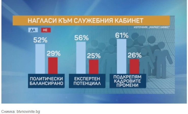 Кадровата политика на служебното правителство също получава одобрение от над половината българи, което е "част от нагласата за промяна и търсене на ново решение на проблемите".