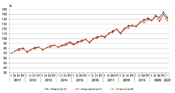Тенденцията на спад в разходите за труд беше доминираща през миналата година, особено в месеците на извънредно положение заради коронавирусната пандемия и налагането на ограничителни мерки. В края на миналата година обаче разходите на работодателите за труд се върнаха към ръст, стимулирани най-вече от увеличението в индустрията (с 4,6%), в услугите (с 8,2%), и в строителството (с 6%).