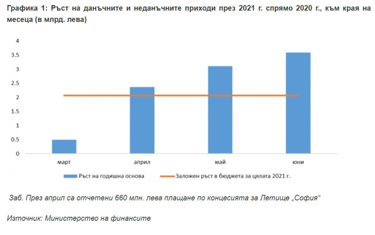 – За полугодието нарастването на данъчните и неданъчните приходи спрямо същия период на 2020 г. е 3,6 млрд. лева. Логично през първото тримесечие ръстът е значително по-малък – 550 млн. лева – като това се дължи на по-високата база от предкризисните месеци на 2020 г. През второто тримесечие увеличението е с 3 млрд. лева, което отразява както рязкото свиване на приходите след въвеждането на извънредното положение през 2020 г. – особено за месеците април и май, така и получените приходи от първоначалното плащане по концесията за Летище „София“ и удължения краен срок за годишното плащане на корпоративния данък.