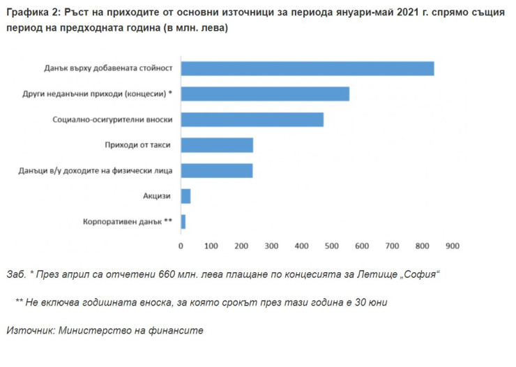 – За целия период от януари до май данъчните приходи в държавния бюджет се увеличават с 1 934 млн. лева, или 21%. Основен принос има ръстът в постъпленията от ДДС – 840 млн., от данък върху доходите – 240 млн. лева и от социално-осигурителни вноски – над 470 млн. лева. Тези резултати са резултат както на възстановяването на заетостта и вътрешното потребление, така и на запазилата се тенденция за нарастване на разходите за труд.
