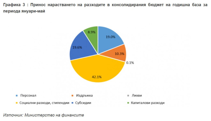 Допълнителен принос имат и решенията за увеличаване с изпреварващ темп на заплатите в част от публичния сектор, както и значителното увеличение на доходите от пенсии заради вдигането на минималната пенсия още от януари и месечните добавки. В публикуваните данни все още не можем да видим приходите от корпоративен данък – срокът беше изместен за 30 юни, а поне по краткото съобщение на министерството на финансите изпълнението е добро. Приходите от такси нарастват с 240 милиона, което вероятно отразява ръст при тол-таксите заради активизирането в товарния транспорт.