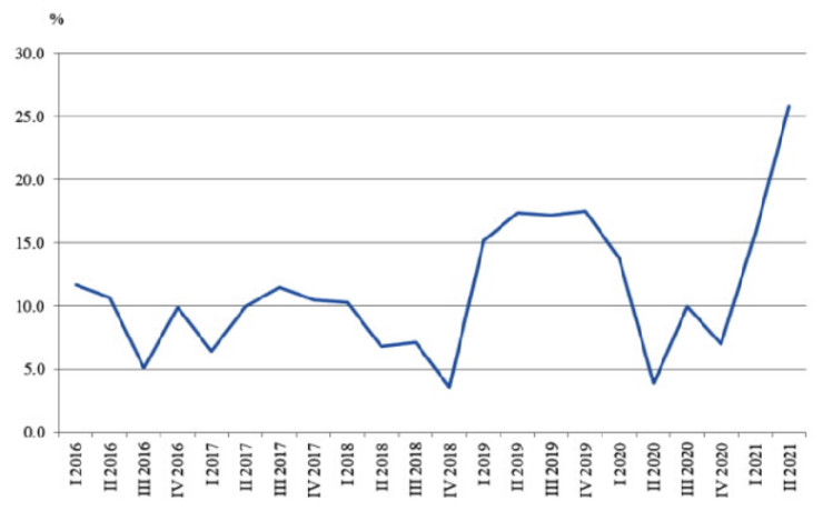 Общият индекс на оборота за сектор „Създаване и разпространение на информация и творчески продукти; Далекосъобщения“, изчислен от календарно изгладени данни, е с 25,8% по-висок през второто тримесечие на 2021 г. в сравнение със същото тримесечие на 2020 г. Най-значителен ръст се наблюдава при „Производство на филми и телевизионни предавания, звукозаписване и издаване на музика“ - с 81,1%, и „Радио- и телевизионна дейност“ - с 38,1%.
