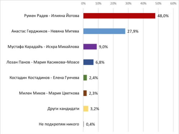 Сред твърдо решилите да гласуват за президент и избралите кого да подкрепят кандидат-президентската двойка Радев/Йотова получава 48,0%, а Герджиков /Митева-Матеева – 27,9%. В последните дни на кампанията социолозите наблюдават известен ръст на подкрепата за кандидатурата на проф. Герджиков. Трети са Мустафа Карадайъ и Искра Михайлова с 9,0%, а четвърти - Панов и Касимова-Моасе с 6,8%. Кандидат-президентската двойка на Възраждане Костадинов и Гунчева получава 2,4%, а тази на ВМРО - Михов и Цветкова – 2,3%.