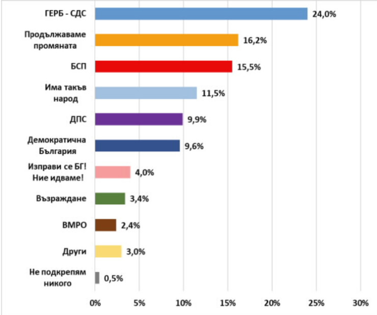 Забележка: Изследването е проведено на територията на Р България и данните не включват информация за вота на избирателите от чужбина.