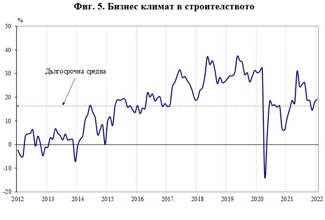 От октомври 2021 г. до януари 2022 г. осигуреността на производството с поръчки (измерена в брой месеци) се увеличава от 4,8 на 5, а средното натоварване на мощностите нараства с 0,8 пункта и достига 75%.