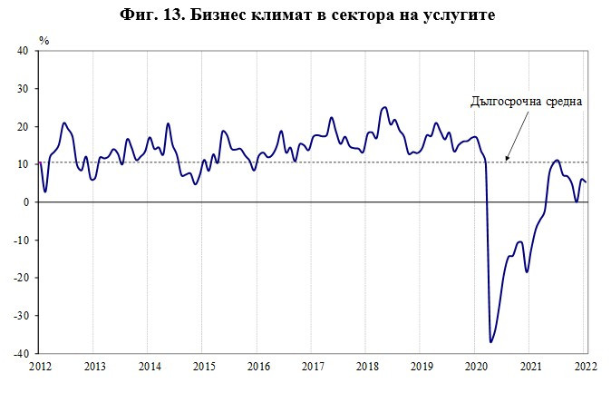 През януари съставният показател „бизнес климат в сектора на услугите“ се понижава с 0,6 пункта в резултат на изместването на очакванията на мениджърите за бизнес състоянието на предприятията през следващите шест месеца от „по-добро“ към запазване на „същото“. По отношение на търсенето на услуги настоящата тенденция се оценява като подобрена, докато очакванията за следващите три месеца са резервирани.