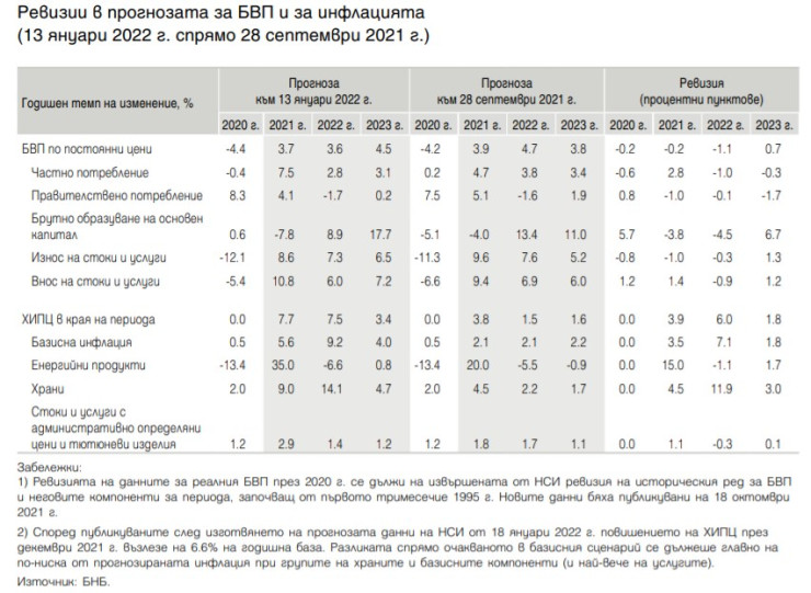 Прогнозата на централната банка за основни макроикономически показатели е изготвена въз основата на информация, публикувана към 13 януари 2022 г. За нея са използвани актуални към тази дата допускания за движението на цените на основни суровини на международните пазари. От тук идва и промяната спрямо предходните прогнози по отношение както на използваната методология, така и на обхвата на разглежданите суровини.