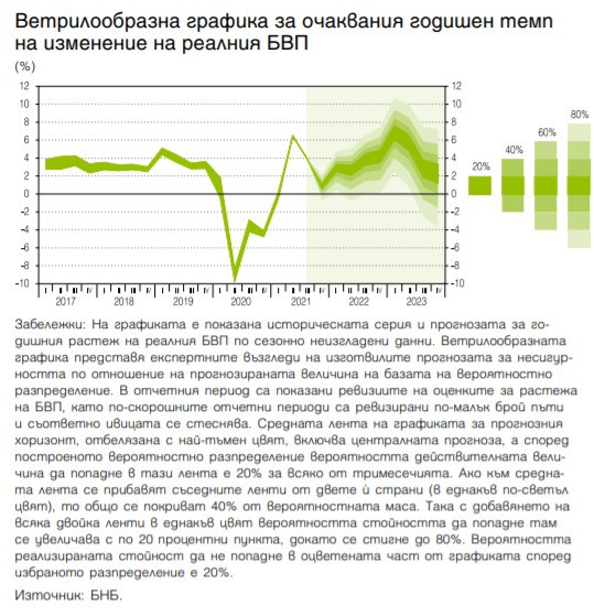 Очакванията на макроикономистите в централната банка се влошават спрямо предишната прогноза от септември, както и спрямо параметрите, заложени от финансовото министерство в макрорамката на проектобюджета. В него разчетите са за 4,8% ръст на БВП за 2022 г. и 5,6% средногодишна инфлация.