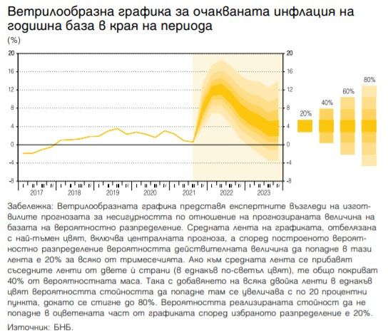 Годишната инфлация, измерена чрез хармонизирания индекс на потребителските цени (ХИПЦ), се очаква да продължи да се ускорява през първото полугодие, след което да се забави до 7,5% в края на 2022 г. Възходящата динамика на потребителските цени ще отразява най-вече повишените разходи за производство и транспорт на фирмите вследствие на същественото поскъпване в края на миналата година на електроенергията за стопански потребители и на други основни енергийни суровини, както и допусканията за продължаващ верижен растеж на цените при някои от тях през първото тримесечие на тази година.