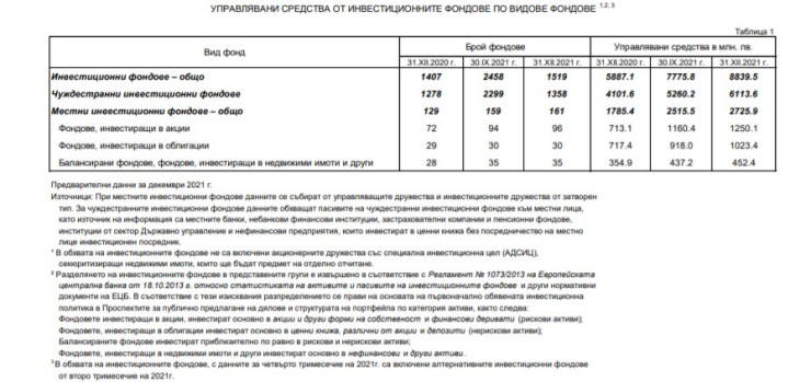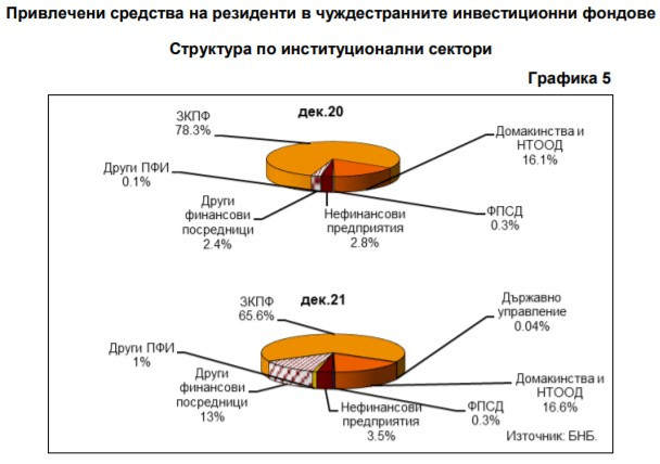 Към края на декември 2021 г. привлечените от резиденти средства в чуждестранните инвестиционни фондове са 6,113 млрд. лева. Спрямо същия месец на 2020 г. (4,101 млрд. лева) те нарастват с 49,1% (2,011 млрд. лева). В сравнение с края на септември размерът се увеличава с 853,4 млн. лева (16,2%).