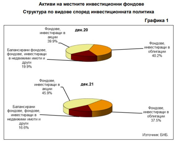 Към края на декември относителният дял на активите на фондовете, инвестиращи в акции от общия размер на активите на местните инвестиционни фондове, е 45,9%, увеличавайки се с 6 пр.п. спрямо декември 2020 г., но намалявайки с 0,2 пр.п. на тримесечна база. Фондовете, инвестиращи в облигации, притежават 37,5% от общата сума на активите към декември 2021 г. при относителен дял от 40,2% към декември 2020 г. и 36,5% към септември 2021 г.