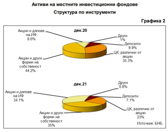 По отношение на инструментите, включени в портфейлите на местните инвестиционни фондове, към декември 2021 г. спрямо година по-рано вложенията в акции и други форми на собственост се увеличават със 165,3 млн. лева (21%) до 954,5 млн. лева, тези в акции/дялове на ИД и ДФ – със 756,3 млн. лева (над четири пъти) до 928,6 млн. лева, а средствата, вложени в ценни книжа, различни от акции, намаляват с 1,9 млн. лева (0,3%) до 627,7 млн. лева.