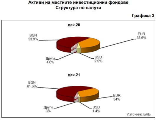 Към края на четвърто тримесечие на 2021 г. основен дял във валутната структура на активите на местните инвестиционни фондове имат средствата, деноминирани в български лева – 61,6%, и в евро – 34%, при съответно 53,9% и 38,6% към декември 2020 г. Към септември 2021 г. активите, деноминирани в български лева, са били 50%, а тези в евро – 44,1%.