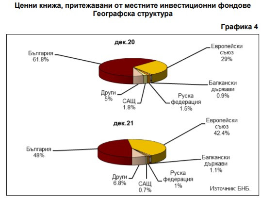 В БНБ пресмятат, че относителният дял на активите на инвестиционните фондове в ценни книжа, емитирани от резиденти на останалите държави от Европейския съюз към декември 2021 г. е 42,4% при 29% към края на декември 2020 г. и 33,9% към септември 2021 година.