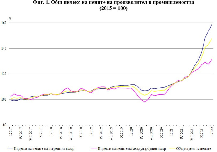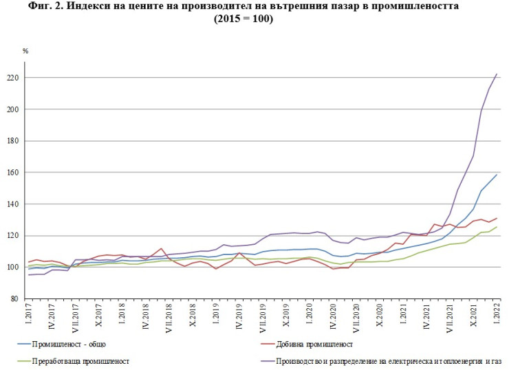 В НСИ изчисляват, че индексът на цените на производител на вътрешния пазар през януари 2022 г. нараства с 42% в сравнение с година по-рано. Ръст на цените е регистриран при производството и разпределението на електрическа и топлоенергия и газ - с 82,2%, в преработващата промишленост - с 19,1%, и в добивната промишленост - с 14,5%.