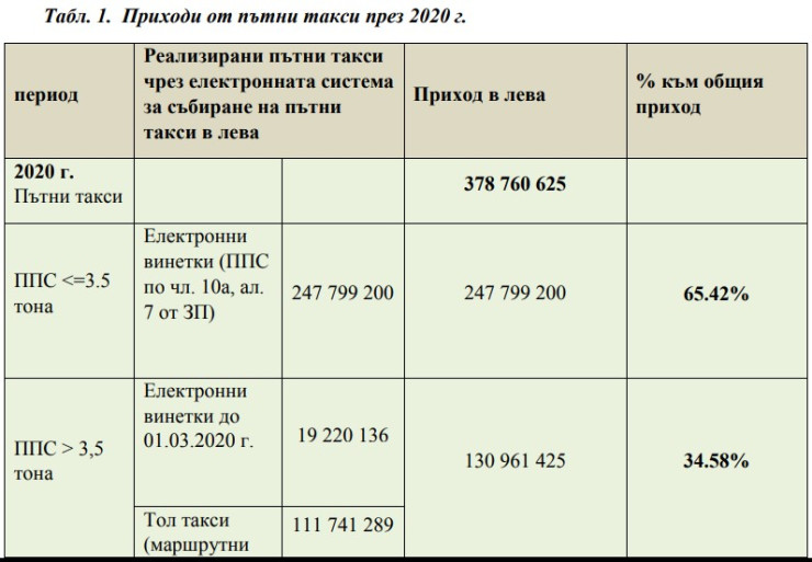 Приходите от пътни такси, чието предназначение е за изграждане/поддържане на републиканската пътна мрежа, се формират от винетните такси за леките превозни средства, независимо от това, че въздействието върху пътната настилка от леките превозни средства е несъпоставимо с това от тежкотоварните пътни превозни средства.