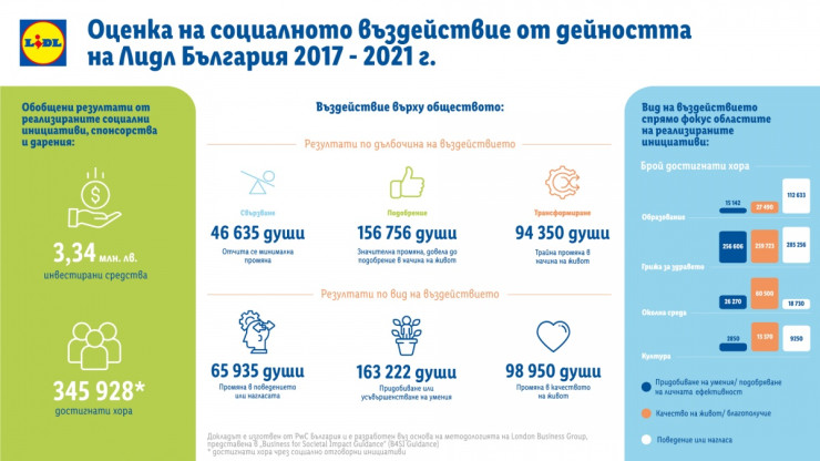 Резултатите от оценката на социалната дейност на Лидл България показват, че 163 222 души са придобили или усъвършенствали своите умения благодарение на инициативите на компанията, а при 98 950 има промяна в качеството на живот. Едновременно с това, 156 756 души посочват, че тази положителна промяна е значителна, а за 94 350 души е настъпила трайна трансформация в начина на живот.