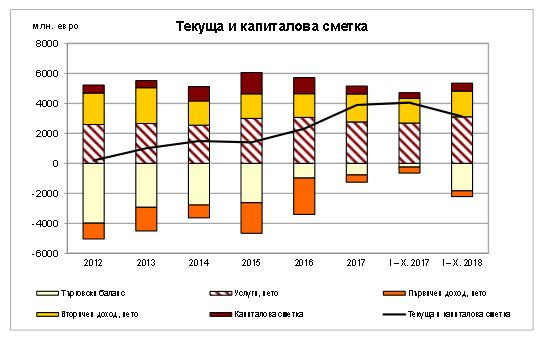 Капиталовата сметка е положителна в размер на 75,8 млн. евро при положителна стойност от 40,6 млн. евро за октомври 2017 г. За януари-октомври 2018 г. тя е положителна – 517,2 млн. евро.