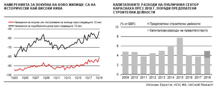 Запазваме нашите позитивни очаквания за жилищното строителство през тази и следващата година. Разрешенията за ново строителство отчетоха поредния двуцифрен ръст на годишна база през четвъртото тримесечие на 2018 г., докато намеренията на домакинствата за придобиване на нови и ремонт на съществуващи жилища достигнаха най високите си нива откакто такива наблюдения се правят в страната, в контекста на нарастващите сигнали, че увеличението в цените на ипотечните кредити засега се отлага.