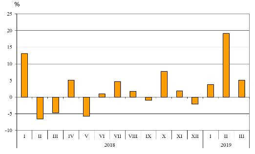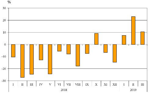 Номинално изменение в стойностния обем на износа на стоки на България за трети страни през периода 2018 - 2019 година (Спрямо същия месец на предходната година)