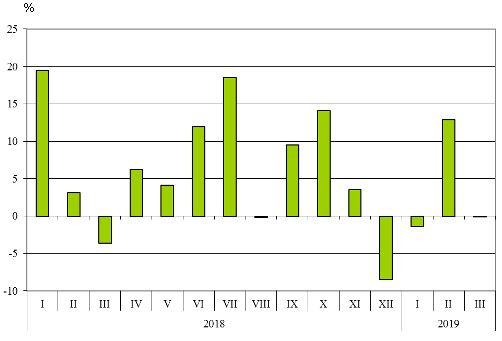 В периода януари - март 2019 г. при износа на български стоки за трети страни, разпределен според Стандартната външнотърговска класификация, най-голям ръст в сравнение със същия период на предходната година е отбелязан в секторите „Мазнини, масла и восъци от животински и растителен произход“ (55,3%) и „Храни и живи животни“ (43,1%). Най-голям спад се наблюдава в сектор „Артикули, класифицирани главно според вида на материала“ (5,9%).