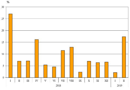 Номинално изменение в стойностния обем на вноса на стоки на България през периода 2018 - 2019 година (Спрямо същия месец на предходната година)