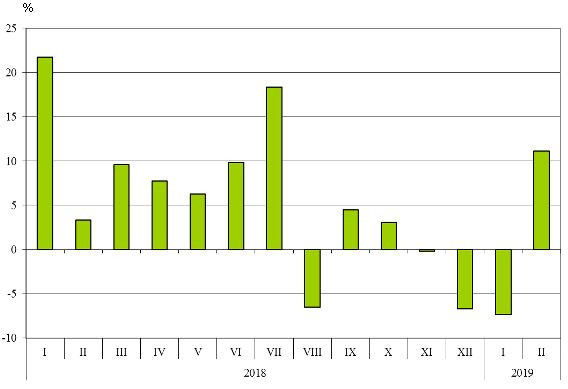 Номинално изменение в стойностния обем на вноса на стоки на България от трети страни през периода 2018 - 2019 година (Спрямо същия месец на предходната година)