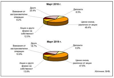 Към края на първото тримесечие относителният дял на ценните книжа, различни от акции, е 47,6% при 49,4% към края на март 2018 г., на акциите и другите форми на собственост – 13,8% при 12,5% към края на март миналата година, на вземанията от застрахователни операции – 10,9% при 9,2% към края на първото тримесечие на 2018 г. и на депозитите – 8,9% при 8,5% към края на март 2018 година.