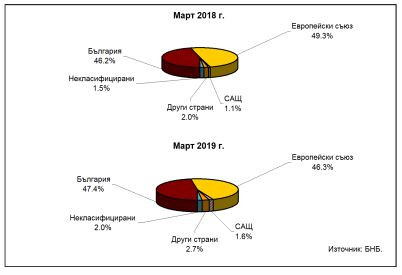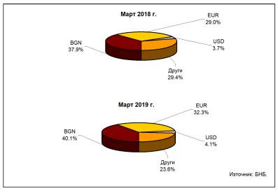 Активите в евро са 32,3% при 29% към края на март 2018 година. Към края на първото тримесечие активите в щатски долари са 4,1% при 3,7% към края на март 2018 г., а в други валути – 23,6% при 29,4% към края на март миналата година.