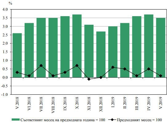 Месечната инфлация през май е 0,1%, а от началото на годината (май 2019 г. спрямо декември 2018 г.) е 1,8%,