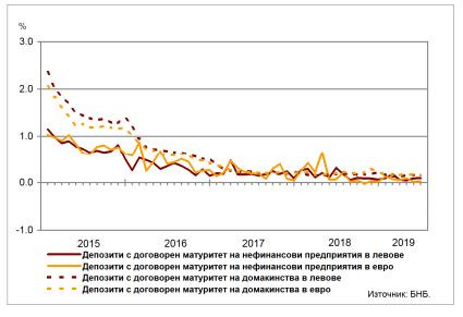 При домакинствата годишният спад на средния лихвен процент на спестяванията с договорен матуритет в левове е с 0,03 пр.п. по-нисък до 0,15%, а по тези в евро – с 0,04 пр.п. до 0,16%. В сравнение с май 2019 г. средните лихвени проценти по депозитите с договорен матуритет в левове и в евро намаляват с 0,01 пр.п.