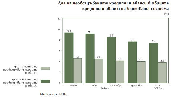 Общите брутни кредити и аванси нараснаха през тримесечието с 2 млрд. лв. (2,2%) до 91 млрд. лв. Нетната стойност на необслужваните кредити и аванси намаля през първото тримесечие на 2019 г. С 0,5%. Делът им в общите нетни кредити и аванси в края на март възлезе на 3,8%.