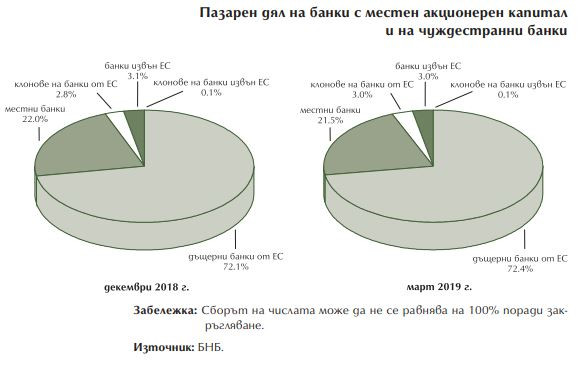 През първото тримесечие на тази година активите на банковата система нараснаха с 2,5% и в края на март възлязоха на 108,2 млрд. лв. Петте най-големи банки формираха 59,8% от общите активи на банковата система, като спрямо края на 2018 г. пазарният им дял нарасна. Делът на банките с местен акционерен капитал в общите активи на банковата система намаля (до 21,5% в края на март 2019 г.). Увеличи се делът на дъщерните банки от ЕС (72,4%) и този на клоновете на банки от ЕС (до 3%)